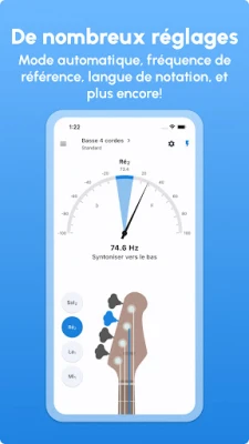 Pour répondre à toutes les exigences, cet instrument polyvalent propose deux approches d'accordage complémentaires. Pour une mise au point ultra-rapide, le mode automatique détecte instantanément la note jouée, offrant des indications claires pour un ajustement express. Mais l'Accordeur de basse va plus loin : il vous permet également d'affiner votre instrument à l'oreille. Touchez simplement une note pour entendre sa tonalité idéale, puis harmonisez votre basse à cette référence sonore. Cette fonctionnalité unique n'assure pas seulement un accordage parfait, elle développe également votre acuité auditive et votre musicalité.