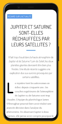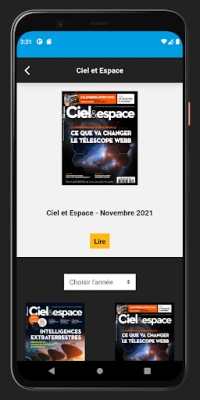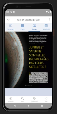 Conçue pour une expérience de lecture optimale, "Ciel et Espace, Le +" offre une série de fonctionnalités ingénieuses. Parcourez vos articles favoris sans connexion internet, parfait pour les voyages lointains ou les observations nocturnes isolées. Personnalisez votre confort visuel grâce à un mode article adaptable : ajustez la taille de la police, choisissez entre les thèmes clair, sombre ou sépia, et optez même pour une police spécialement conçue pour faciliter la lecture des personnes dyslexiques. Ne perdez plus le fil de vos découvertes avec la possibilité d'ajouter des signets, et localisez instantanément tout sujet grâce à la recherche par mot-clé intégrée à chaque parution. Vous serez également averti en avant-première de la disponibilité d'une nouvelle publication grâce à des notifications discrètes.