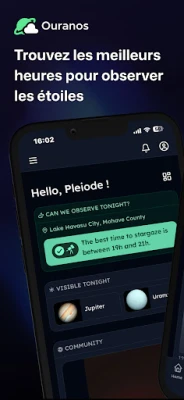 Au-delà des données météorologiques, Ouranos est votre assistant personnel pour naviguer dans l'immensité céleste. Suivez avec précision les heures de lever et de coucher des planètes, de la Lune et des étoiles, et identifiez la visibilité optimale des objets du ciel profond. Des graphiques interactifs intuitifs vous aideront à orchestrer vos sessions d'observation, tandis qu'un calendrier exhaustif vous alertera sur plus de 500 événements astronomiques annuels, des pluies de météores aux éclipses et conjonctions spectaculaires. Connectez-vous ensuite à une communauté vibrante : partagez vos propres chefs-d'œuvre d'astrophotographie dans une galerie publique, explorez les clichés d'autres passionnés et échangez conseils et techniques pour affiner votre art de l'observation.